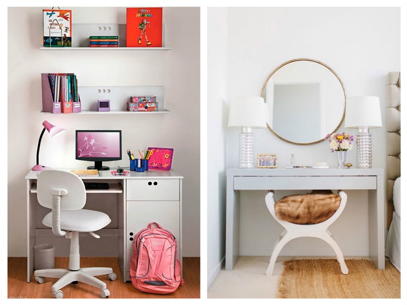 Em cima da mesa ficou minha impressora, pote com canetas, espelho de aumento para maquiagem, pincéis e uma linda mini penteadeira espelhada. O que acharam?