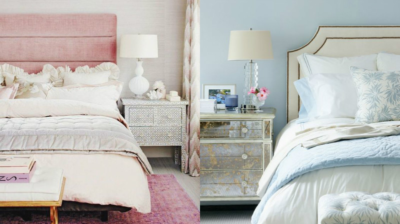 Eu amei esse rosinha tão clarinho e sereno na decoração da primeira foto. Gosto de um quarto Clean com toques de cor, e por isso amei os pequenos detalhes. O tapete, a cabeceira, o livro… Trazem uma sensação de conforto e tranquilidade, realmente uma harmonia. Na segunda foto temo o serenity, o azul. Gostei da leveza e do toque sutil, aqui uma decoração calma e que transmite paz. O toque com a flor na cor Rose trouxe um agrado todo especial.